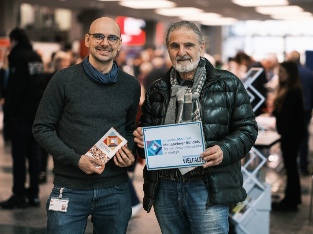 Beim Neujahresempfang der Stadt Mannheim, am 6. Januar 2026 im Rosengarten begegneten sich Teile des Vorstands des Künstlerbundes Rhein-Neckar und Andreas Schmitt vom Mannheimer Bündnis. In einem vorläufigen Zeichen des Vertrauens wurde uns, vertreten durch unseren Vorsitzenden Tom Feritsch, bereits dieses Schild überreicht. Der Antrag auf Aufnahme des Künstlerbundes in das Mannheimer Bündnis befindet sich derzeit in Bearbeitung. Wir freuen uns darauf, in absehbarer Zeit offiziell Teil dieses Zusammenschlusses zu werden.